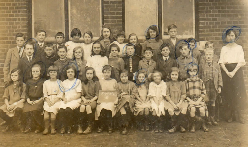 Back Row – Unknown boy, Peter Catchpole, unknown 2 girls and 3 boys, Teacher Mrs Knock (used to bike to Elmswell every day from her home in Tostock)