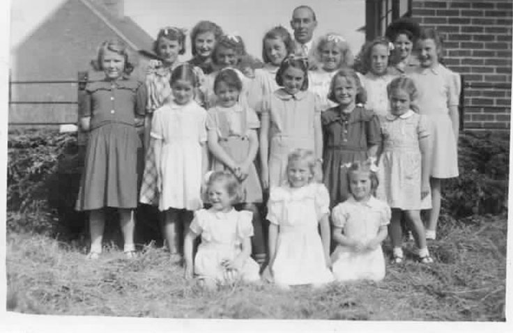Middle Row – Sheila Reddit, Wendy Rose, Valerie Scase, Phillips girl, Audrey Goymer Back Row – Phillips girl, 3 unknown girls, Mary Frost, Percy Moss(?), Mary Wright, Unknown girl, Phyllis Cuthbert (lady in hat), Unknown girl.
