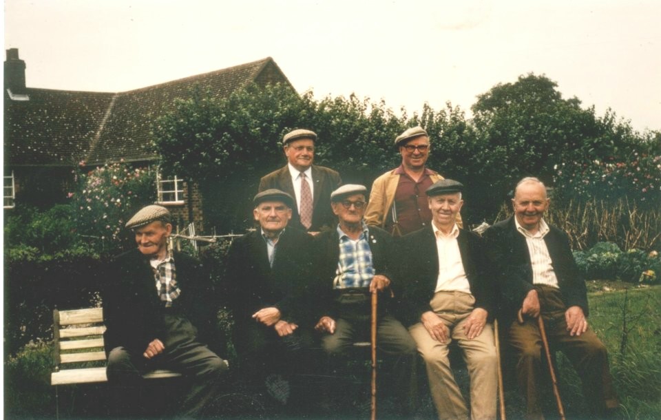 Corner seat Cooks Road: Bob Manning, A Farrow//Butty Manning, Fred Borley, Vic Huffey, Bill Hunt, "Tupney" Church