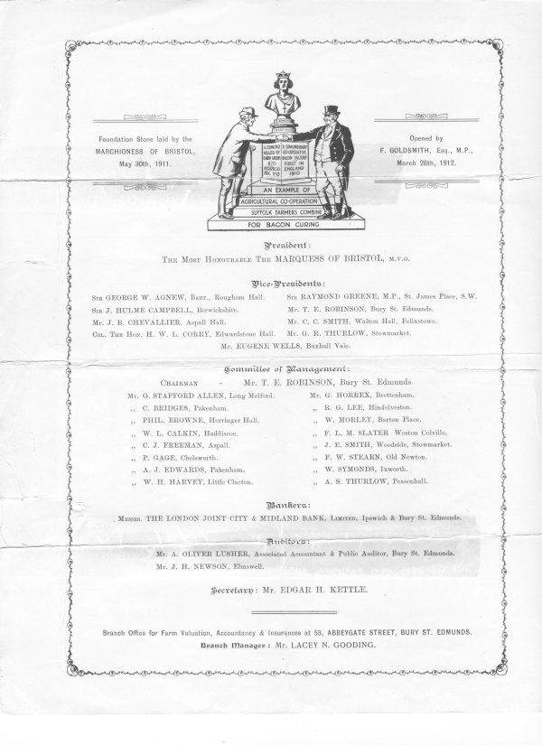There is no need however to be unduly pessimistic about the situation. Your Society is in a sound financial position. The Balance Sheet shows that we have assets to cover the Share Capital and Bonds and leave approximately £20,000 in reserve. We are determined to carry on and to “weather the storm” but we want your assistance. We cannot make Bacon without pigs and it is pigs that we want of a suitable kind. My advice to you as Farmers and Members of this Society is to breed more pigs. No Live Stock on the Farm today shows so good a return as the Sow and her litter and so long as the Embargo continues, and there is not the slightest sign of its removal, there is every likelihood of them doing so.