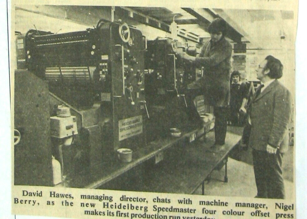 However there followed rapid technological changes in the printing industry: for example, the old letterpress system (slower because using reciprocating motion) was gradually replaced by offset litho (rotary, so many times faster) which was less labour intensive. In early 1979 the firm, keen to take advantage of Common Market membership and secure orders from abroad, invested £125,000 in a Heidelberg Speedmaster, a four-colour offset press which was able to print full-colour leaflets, brochures etc. The output included much advertising material but also books and pamphlets for English Heritage and other restoration organisations; the books Lost houses of Wales and Lost houses of Scotland were in demand even after the firm ceased trading years later.
