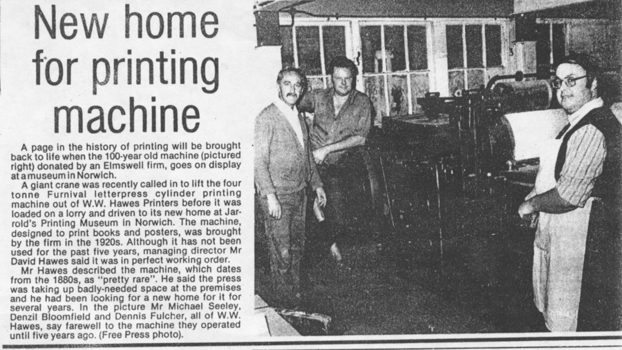 By the mid 1950s things were better and Hawes purchased a second-hand Heidelberg Super speed Platen (it was virually impossible to find new equipment). This fed the paper into the printing machine automatically, speeding output from 900 copies per hour to about 3,000. Over the following years more machines were added, and staff increased to 12-15 by the end of the decade. While most of the men were local, shortage of skilled craftsmen in the printing industry made it necessary to recruit staff from further afield (Bury, Diss) and to train apprentices as compositors and machine minders.