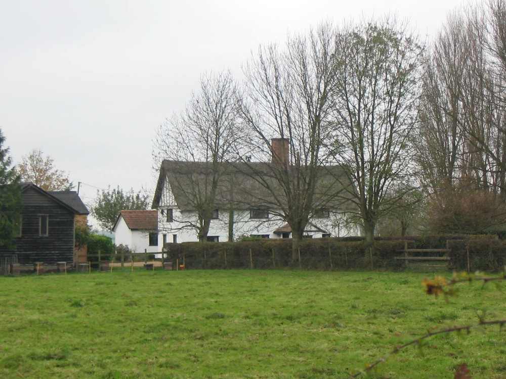 Farmhouse, early C17 or earlier. 2 storeys. 4 windows. 3-cell lobby-entrance plan. Timber-framed and plastered. Thatched roof with axial chimney of C17 red brick. C20 casements with leaded glazing. C20 gabled porch at lobby-entrance position. The right hand (parlour) cell is lower at the ridgeline than the rest of the building and probably built at a different time.