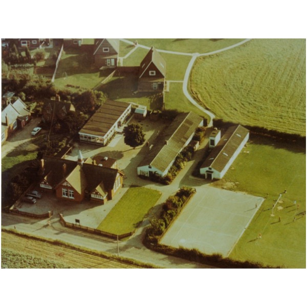 In the aerial photo, on the far left is the first school and master’s house, built in 1865; Gordon Goymer identified these as the old Church Hall and School House, the latter housing the caretaker (Mrs Roper in his time). Centre-left is the Board School, built in 1890; third and second from right are extra classroom blocks added later, likewise the canteen block, far right.