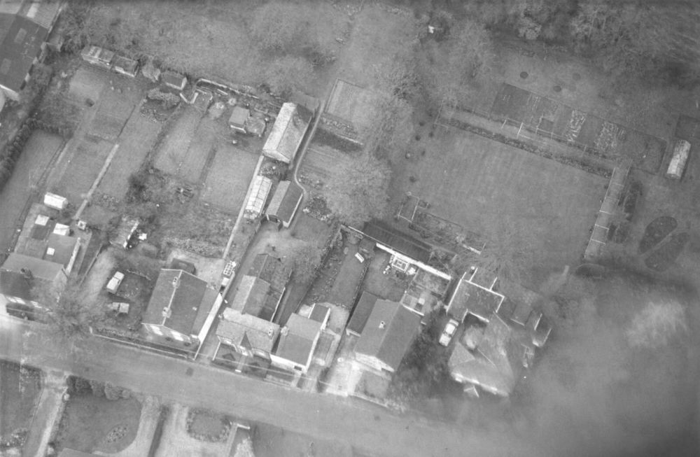 Roseacre is at the right, partly obscured by some mistiness on the window of the aircraft. It still has its extensive garden (sold off for infill housing at the end of the century), but the smithy to the south (left) of it has been replaced by another dwelling, leaving only the rear outbuildings. *Names of dwellings on this page were valid at least over the period 1988-2009