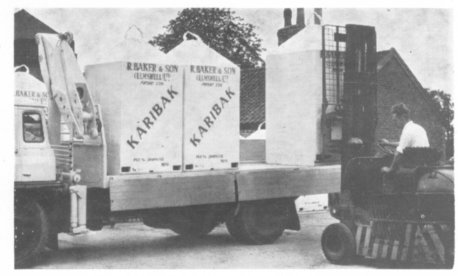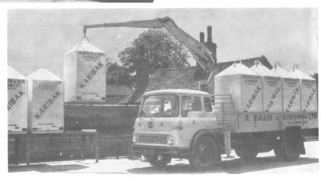 From the millers’ point of view, too, the bins appear to have many advantages. Mr. Baker was anxious to start a bulk delivery service but the storage bins at the mill, the auger or pneumatic systems for hand- ling the meal, the weighbridge and the bulk delivery lorries would have cost him well over £10,000—an investment a rela- tively small-scale country compounder could not justify. So about 15 months ago he set about solving the problem and his brain-child is the Karibak bin system. His 10-ton lorry will hold eight one-ton bins, all loaded at the mill by a fork life truck and un- loaded on the farm with the Atlas crane on the lorry.