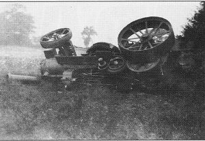 During the summer of 1936, an unfortunate accident occurred with the ploughing tackle. On a farm at Combs near Stowmarket, a mole drainer became entangled with a stubborn tree root, which dragged the engine over on its side, smashing the chimney, the flywheel and, more importantly, the safety valve on the steam chest. The escaping steam blew a hole in the ground and enveloped the whole scene in an impenetrable cloud of steam and dust. Luckily, the driver had managed to jump off the footplate clear of the engine before it toppled. One of the advantages in operating a pair of engines was that if something untoward happened to one of them there was always the other nearby to render aid. The toppled engine was soon righted and, by a stroke of good fortune, a spare flywheel was available back at base. The other repairs were within the capacity of the staff and work was resumed fairly promptly.